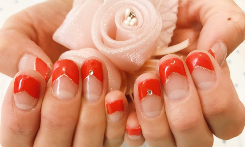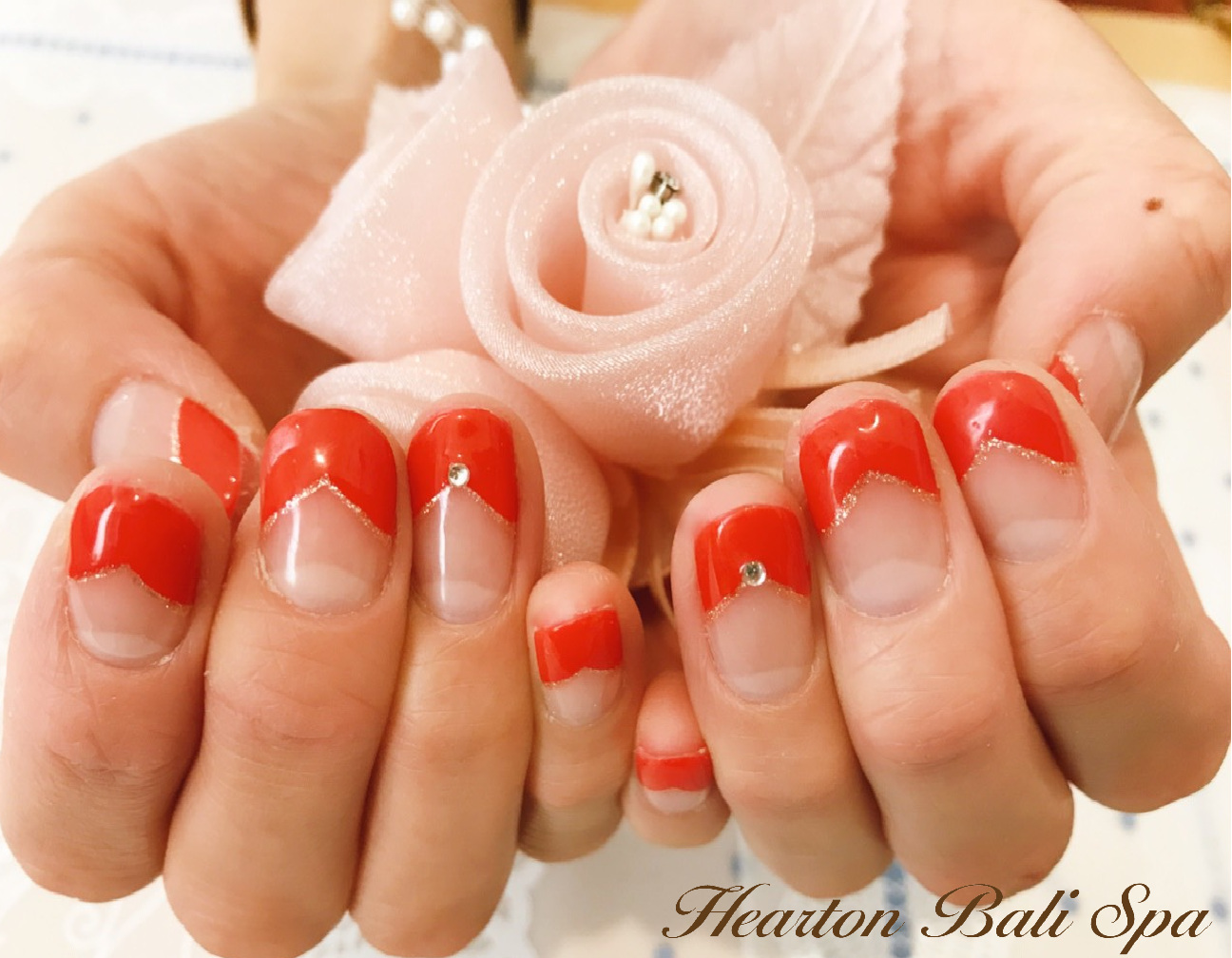 先日のお客様(*^^*) 赤のフレンチにピンクゴールドのラメラインを入れポイントで 薬指にストーンをのせました♪