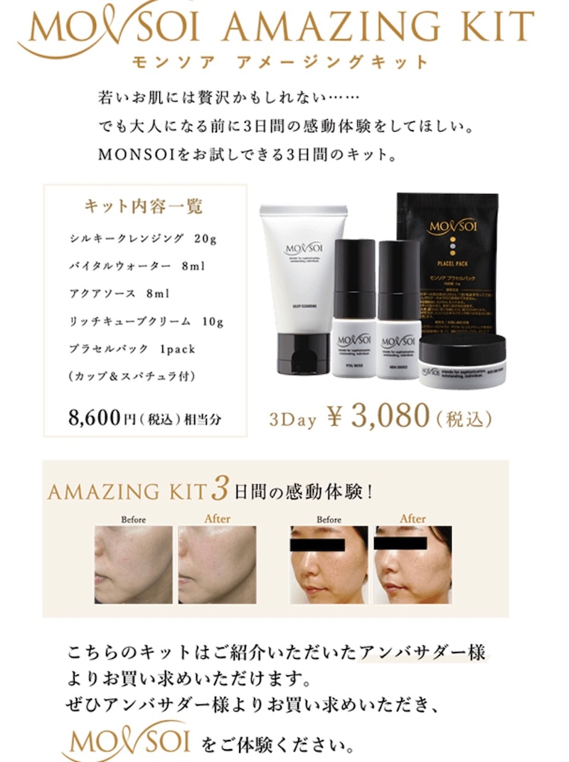 今までエステサロンで扱うサロン専売化粧品はお店での対面販売でしかお渡しできなかったのですが、モンソアはネットから購入可能になりました(*^^*)