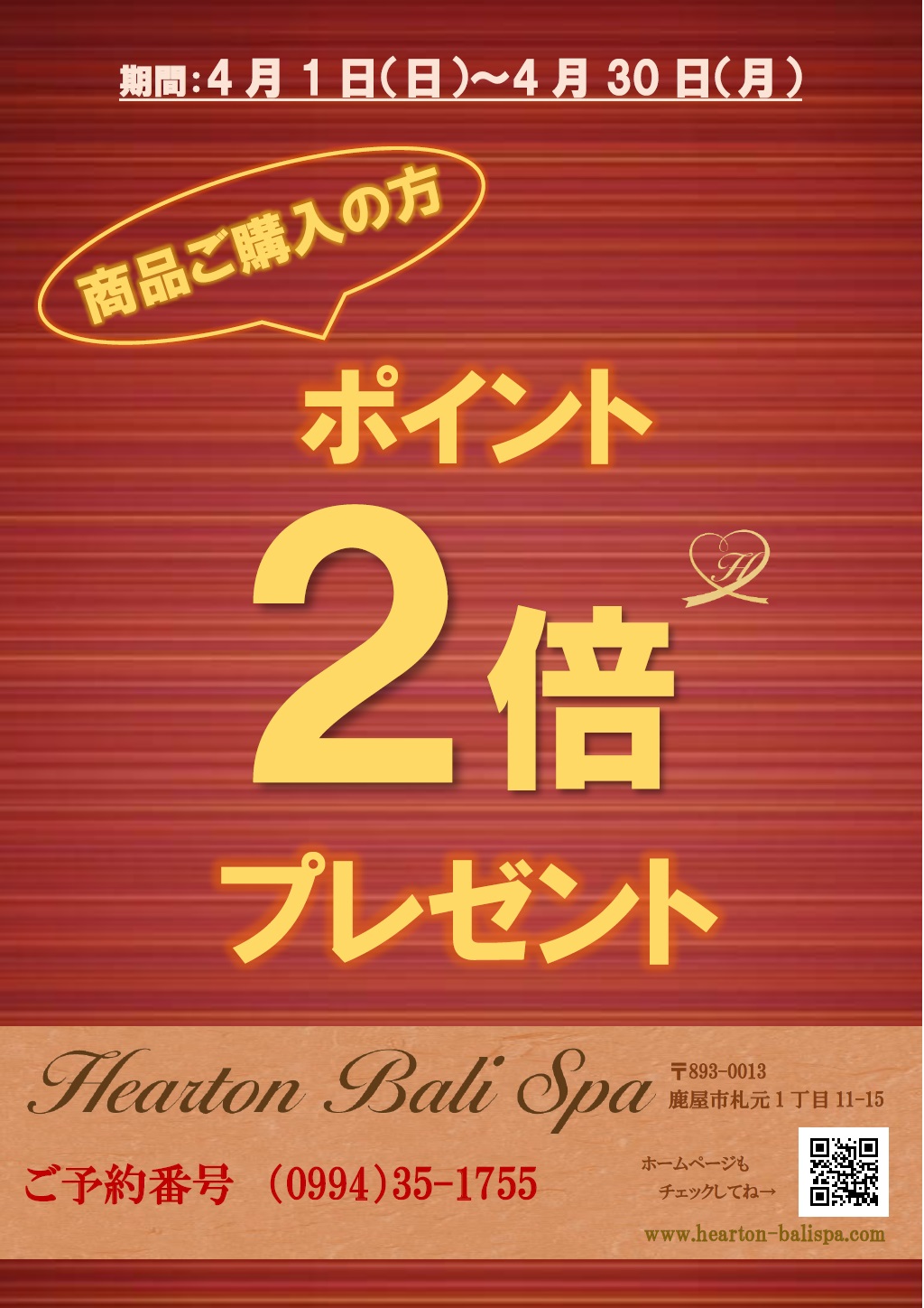 4月1日~30日までの期間、ショッピングポイントが、2倍!!!