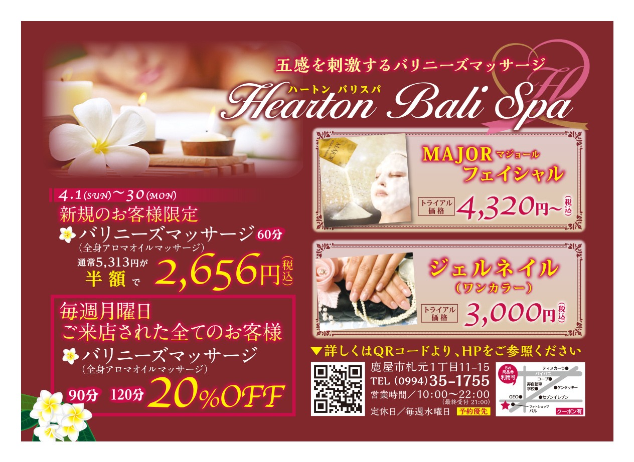 4月の毎週月曜日・・・ バリニーズマッサージ90分&120分⇒20%OFF✨
